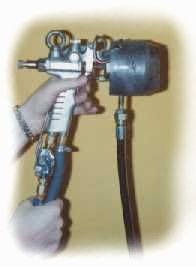 Der Beschichtungsstoff wird in der eigentlichen Spritzpistole entweder aus einem Lackbecher oder direkt über einen Schlauch aus einem großen Vorratsbehälter zugeführt. Auch ist es bei zweikomponentigen Lacken möglich, Binder und Härter erst direkt in der Pistole zu mischen, wodurch es praktisch keine Topfzeiten gibt.